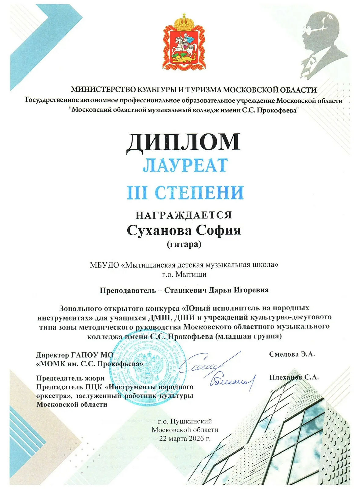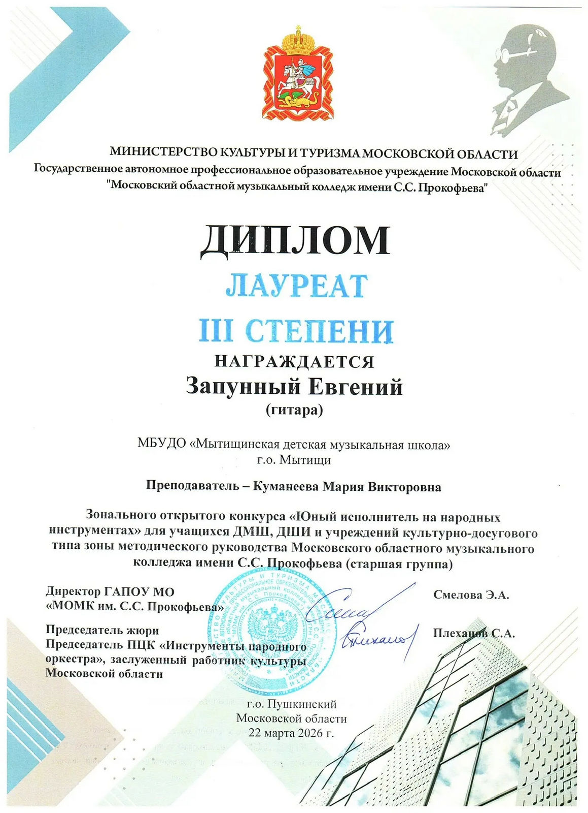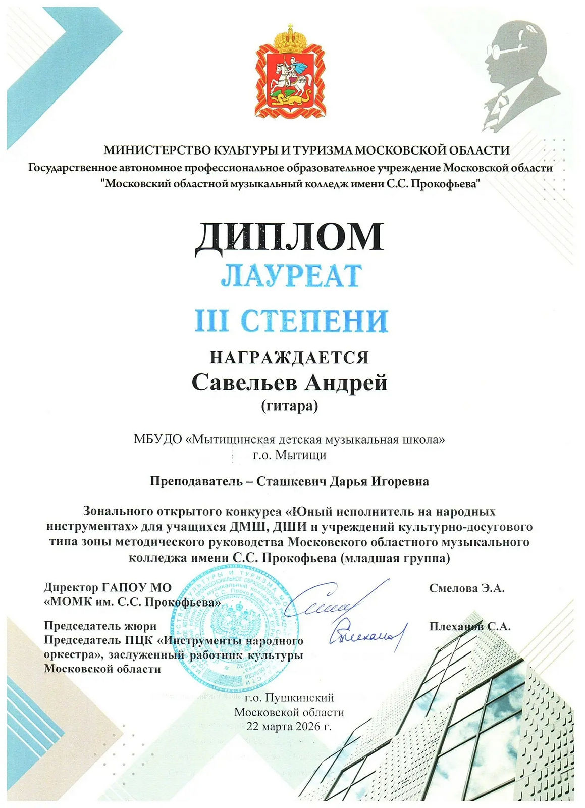 Лауреаты III степени — Нечипоренко Елисей, Запунный Евгений (пр. Куманеева М.В.); Суханова София , Савельев Андрей (пр. Сташкевич Д.И.);
