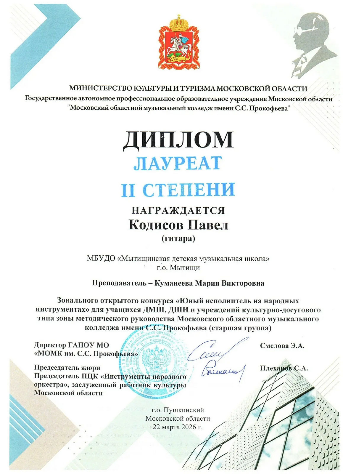 Лауреаты II степени — Кодисов Павел (пр.Куманеева М.В.);